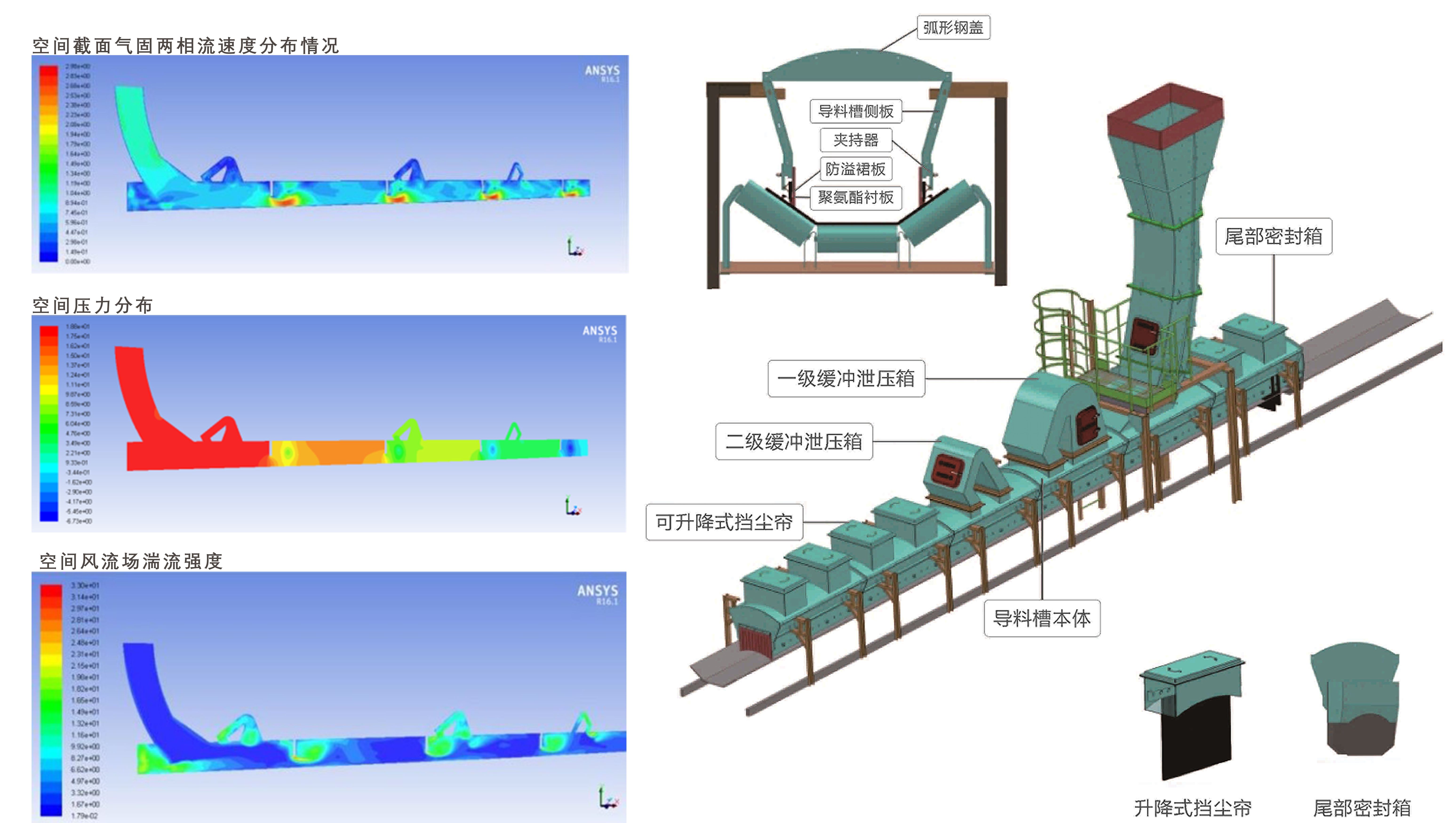 3-DEM惯性除尘导料槽采用全密封的方式,使导料槽内处于微正压状态而非负压,整体设计建立在尾部和两侧密封可靠的基础之上,让整体设备实现无动力环保除尘。同时,通过EDEM-CFD仿真(两相流)分析,可以分析导料槽内各点的压强、风的速度和湍流强度,对导料槽进行精确设计