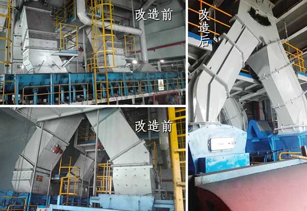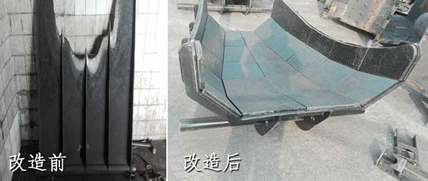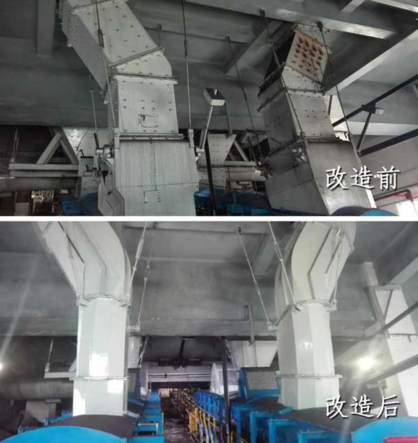 改造前,落煤管为四边形,棱角容易挂料,造成堵煤;落煤管衬板为螺栓连接方式,煤流冲击衬板,导致震动后螺栓孔漏粉。改造后,落煤管流线型设计,逐渐改变煤流的流向,加之多边形设计,棱角几乎不会挂料,从而解决堵煤问题;落煤管采用整体式衬板设计,煤流冲击面采用格栅结构,落煤管使用寿命提高数倍以上。