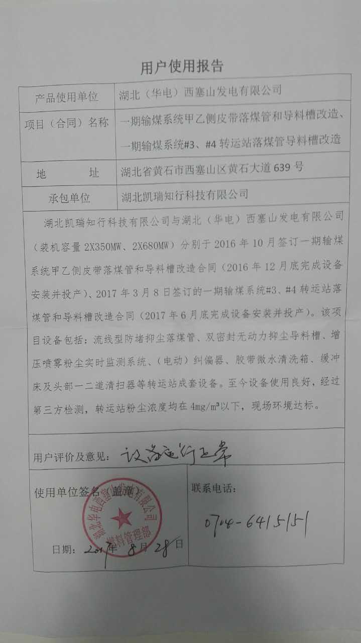 我公司在湖北华电西塞山发电有限公司一期输煤系统#3、#4转运站及二期输煤系统碎煤机室落煤管和导料槽改造项目上,从前期方案设计、设备生产供货、安装调试等环节均严格按照合同协议,保质保量完成。改造后,输煤生产现场环境得到很大改观,得到业主方的一致好评。