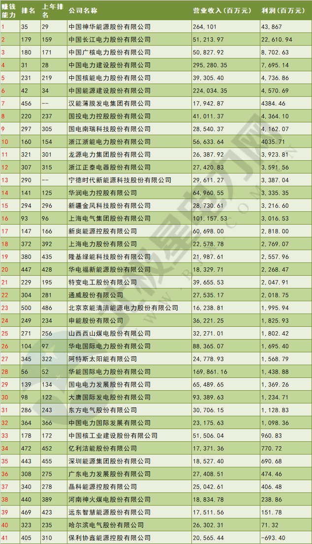 表3 41家电力企业赚钱能力排行