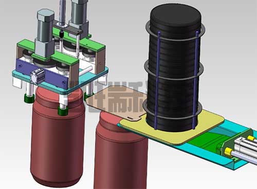 该装置与采样机系统连锁,当接收采样命令时,空桶自动到位接料,并能对到达指定位的空桶进行芯片及空桶重量验证,判断此处空桶是否满足接料条件。当空桶信息验证通过时,次级煤样下料溜管斜插板门开启进行装料,装料过程中自动判断样桶重量状态,根据反馈重量信息控制下料溜管斜插板的开启和闭合;该装置实现自动将样桶固定,自动送盖、压盖、封盖功能,人工将桶盖摆放在桶盖架中,封盖合格率达到100%。