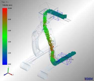 3-DEM曲线落煤管技术是基于离散元方法,采用SolidWorks三维立体设计建模技术,借助于专业的颗粒学仿真软件,对散状物料输送过程中颗粒体系的行为特征进行较真实的模拟,从而协助设计人员对散状物料处理设备进行设计、测试和优化。