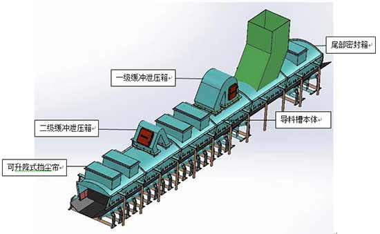 皮带机尾部导料槽进口位置安装3—DEM导料槽尾部密封装置,多重密封结构可确保粉尘均无法从尾部喷出。