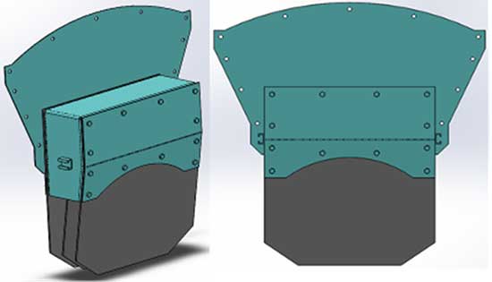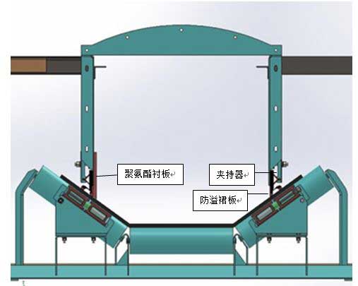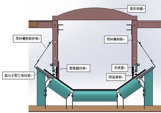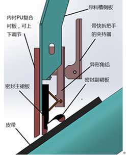 导料槽采用双密封结构,并加大导料槽的容积有效降低导料槽内风压。其结构如下:导料槽侧板内侧采用高分子聚氨酯耐磨衬板,衬板可上下调节,最低距离皮带高度不大于5mm, 可起到一级密封;导料槽侧板外侧安装超高分子聚氨酯防溢裙摆,可起到二级密封,防溢裙摆为双层弹性密封,确保导料槽的完全密封。