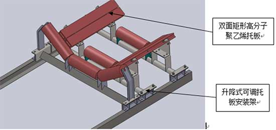 导料槽下部采用双面矩形托板结构,料点前后布置双面矩形耐磨托板防止物料冲击胶带产生跳动,提高密封等级。矩形托板采用超高分子聚乙烯材料,可双面使用,提高部件使用寿命。