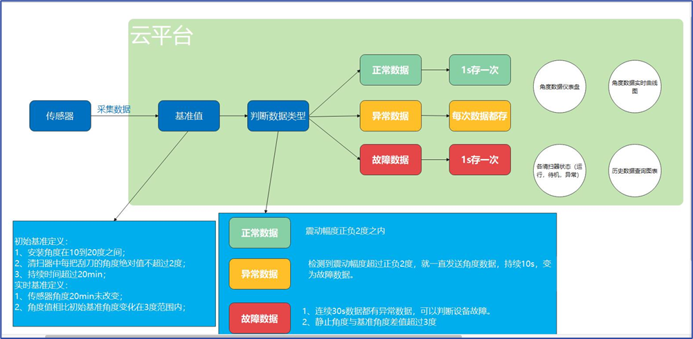 ◆角度采样器定时/实时采样刮刀的工作角度,并通过网关上传至云平台 ◆云平台通过数据模型分析刮刀的实时工作状态,以及胶带表面的工况 ◆异常发生时,系统通过公众号、微信小程序等方式及时告知用户 |
