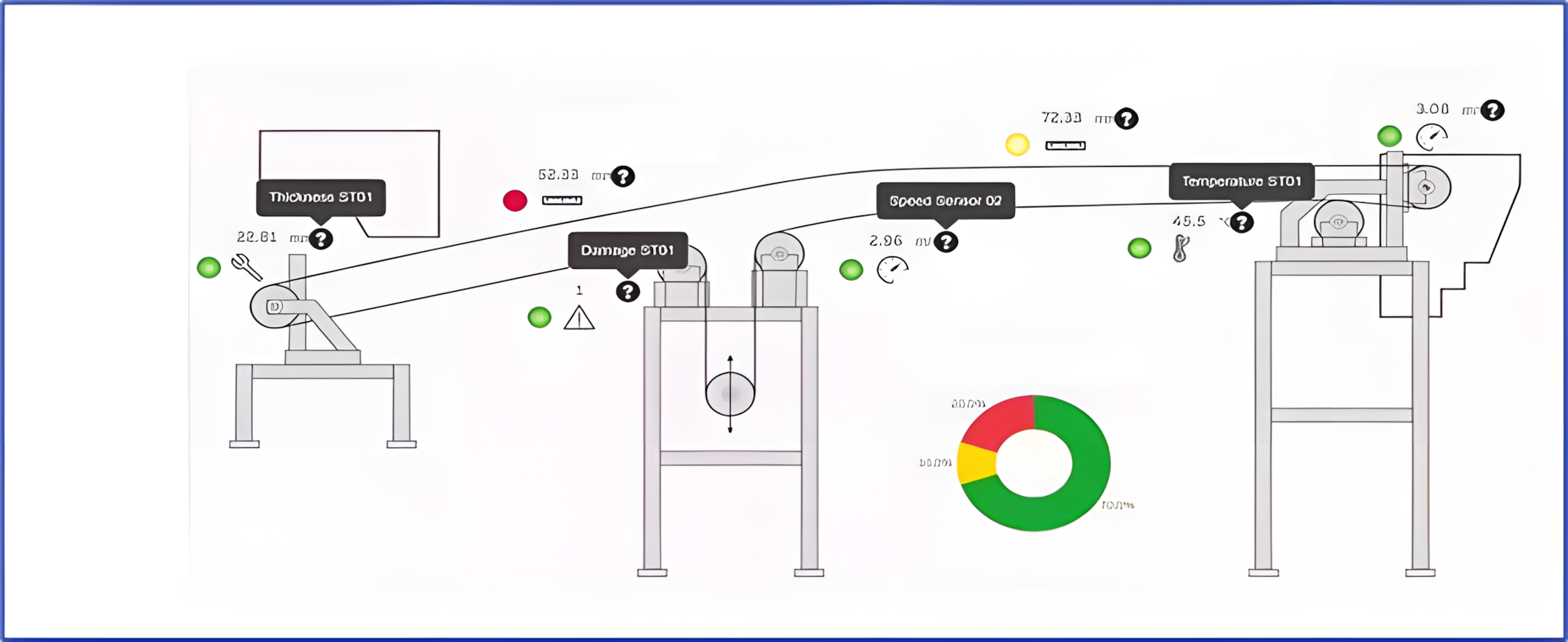 回程胶带跑偏检测和保护 在胶带回程驱动站、张紧间等胶带改向位置安装回程胶带跑偏检测装置,使跑偏信号信号数字化 ,配置电动纠偏装置 数据融合应用 通过数字化技术应用,提前预测胶带机状态,避免意外停机,改善传送带的可靠性和使用寿命。 |