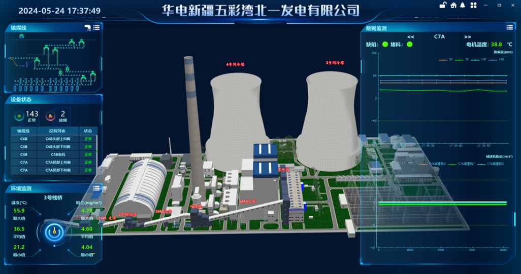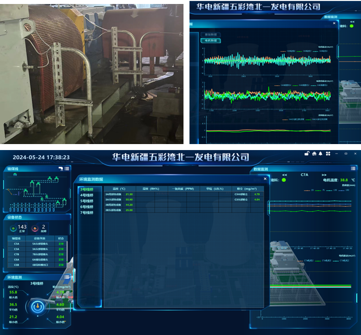 2.头、尾部热成像界面与粉尘检测界面,以及在输煤系统重要设备上增加温度与振动监测传感器,有效的对设备的运行状态进行监测。