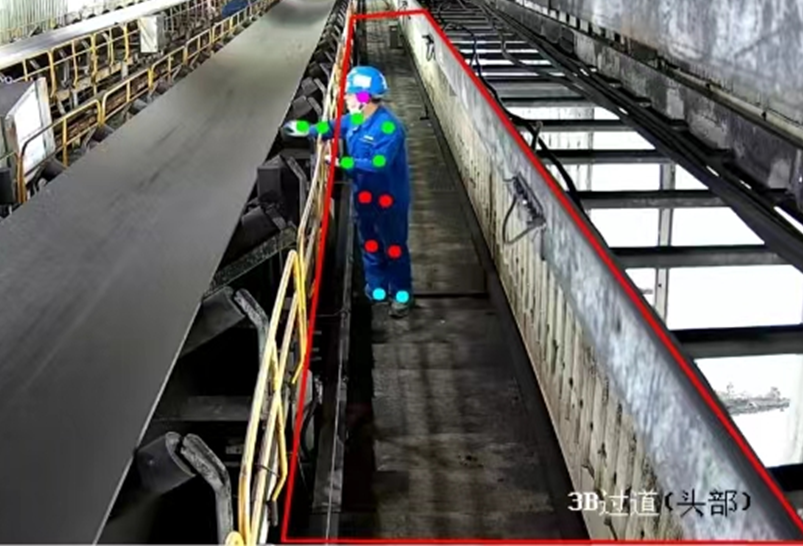 3.电子围栏:通过摄像头提供图像,经过软件算法,自动识别输煤区域人员违章行为并进行告警、提示。