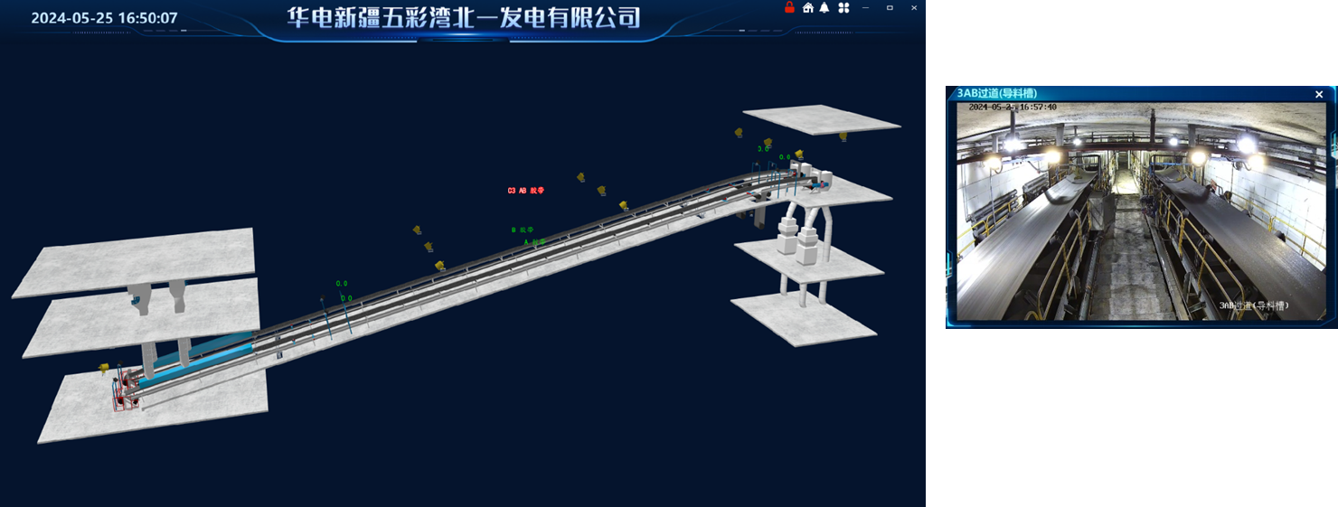 2.管控大平台内建立输煤栈桥三维立体图,并将新增设备通过算法将模型与现场摄像头实时画面融合,通过点击三维模型可获取现场画面。