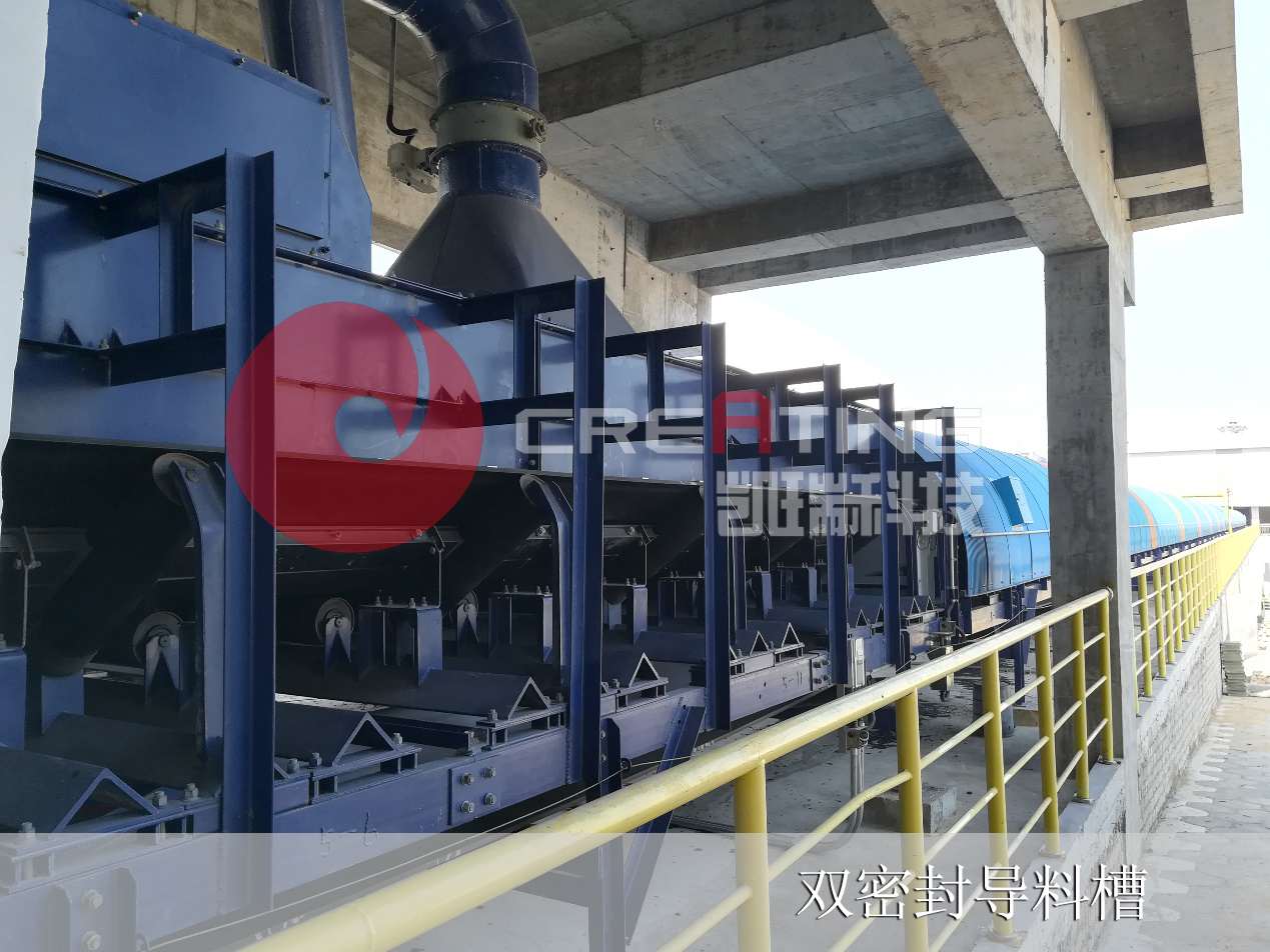 ◆ 双密封导料槽无动力除尘导料槽采用双层密封,侧板内侧密封为聚氨酯衬板作为第一层密封,阻挡、汇集大冲击大颗粒物料;